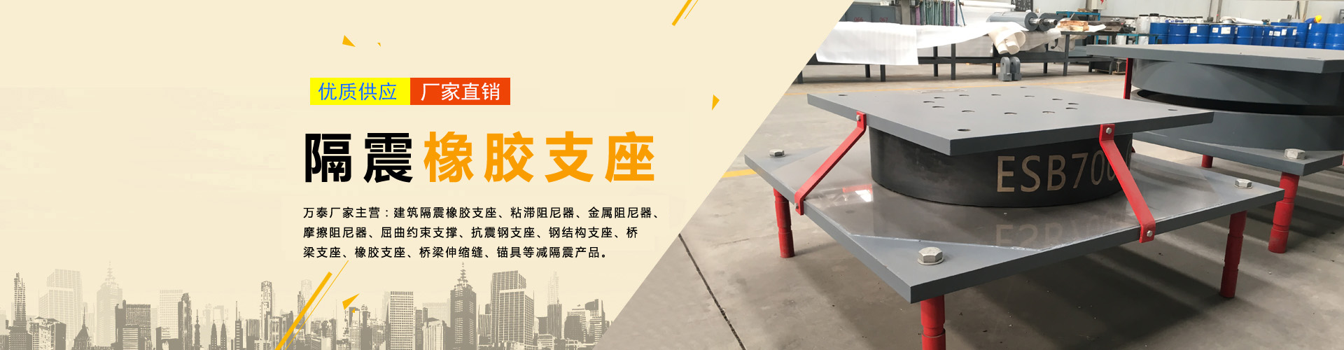 我公司專業(yè)設計、生產(chǎn)、銷售建筑橋梁減隔震產(chǎn)品。隔震產(chǎn)品主要有:隔震橡膠支座、鉛芯橡膠支座、抗拉裝置、抗風裝置;減震產(chǎn)品主要有:屈曲約束支撐、剪切型金屬阻尼器、摩擦阻尼器、連梁阻尼器、粘滯阻尼器、粘滯阻尼墻、粘彈阻尼器;機電抗震產(chǎn)品主要有:設備隔震支座、設備減震墊板;網(wǎng)架及鋼結(jié)構支座系列產(chǎn)品主要有:網(wǎng)架橡膠支座、球型鋼支座、球鉸支座、減震鋼支座、網(wǎng)架抗拉支座;橋梁支座產(chǎn)品主要有:盆式支座、球型支座、橡膠支座、摩擦擺式支座、高阻尼隔震支座、水平分散力支座、鉛芯隔震支座、防落梁裝置、抗震擋塊;橋梁伸縮裝置系列產(chǎn)品主要有:模數(shù)式伸縮裝置、梳齒板型伸縮裝置、多向變位式伸縮裝置。 本公司全體員工...... 【更多詳情】